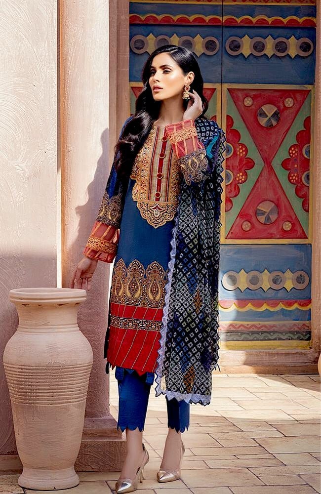 Fabric: 3 Piece Embroidered Digital Printed Dress Print Details: Shirt: Digital Printed Lawn Dupatta: Digital Printed Chiffon Trouser: Dyed Cambric Embroidery Details: Thread Embroidered Gala on Shirt Thread Embroidered Border For Sleeves |