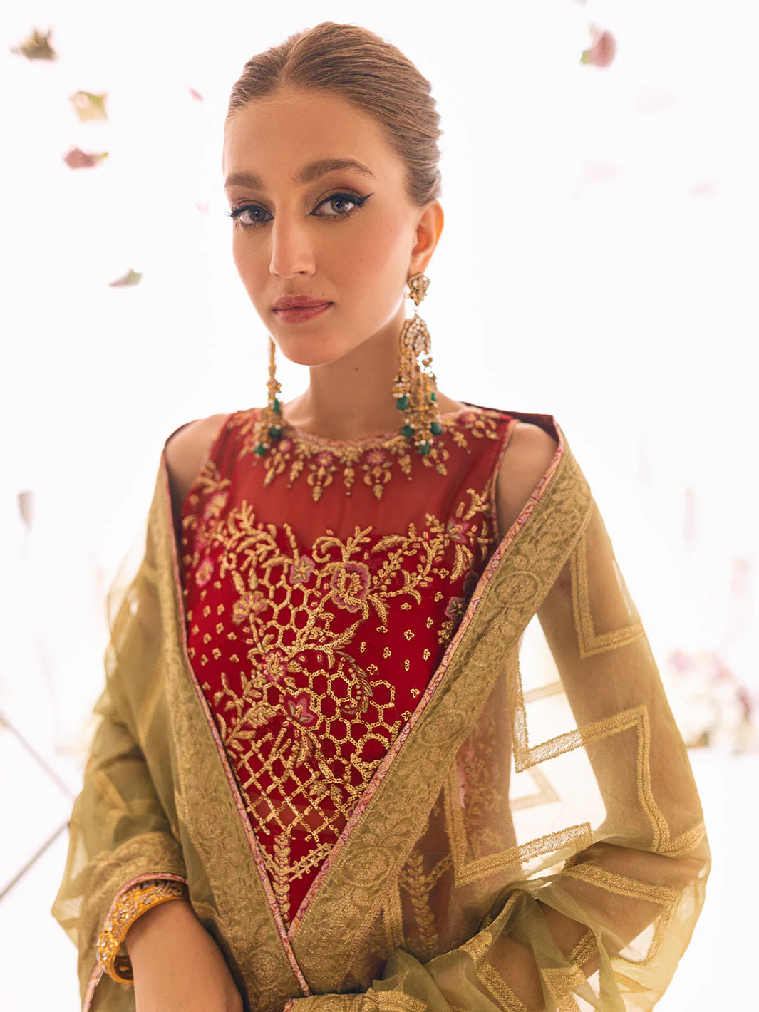 Fabric: Embroidered & Sequinned Chiffon for Front Yoke Embroidered & Sequinned Chiffon for Back Yoke Embroidered & Sequinned Chiffon Front Embroidered & Sequinned Chiffon Back Embroidered & Sequinned Chiffon Sleeves Embroidered & Sequinned Front & Back Daman Border on Organza Jaquard Organza Dupatta Cotton Silk for Under Shirt Raw Silk Dyed Trouser |