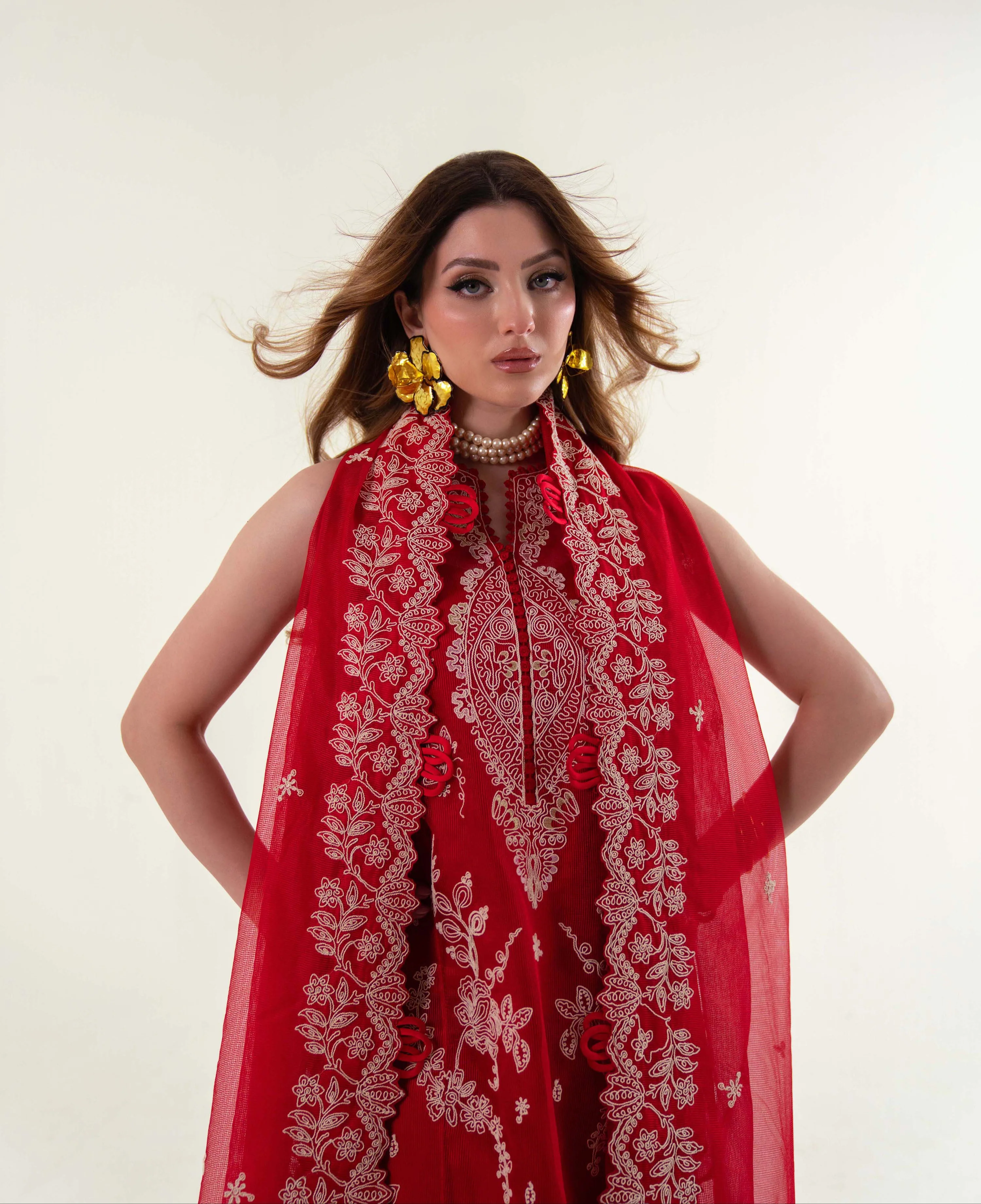 Fabric: SL-02 4 PCS 1. EMBROIDERED CENTER PANEL ON DYED RAJJO NET FABRIC L=40” x W=13” 01 2. EMBROIDERED LEFT SIDE PANEL ON DYED RAJJO NET FABRIC L=40” x W=13” 01 3. EMBROIDERED RIGHT SIDE PANEL ON DYED RAJJO NET FABRIC L=40” x W=13” 01 4. EMBROIDERED FRONT SIDE PATTI ON ORGANZA FABRIC 2M 01 5. EMBROIDERED HEM BORDER ON ORGANZA FABRIC 1M 01 6. PLAIN SLEEVES DYED RAJJO NET FABRIC L=27” 01 7. EMBROIDERED SLEEVES PATCH ON ORGANZA FABRIC 02 8. PLAIN BACK DYED RAJJO NET FABRIC L=50” 01 9. EMBROIDERED DUPATTA RUNNING ON DYED RAJJO NET FABRIC 74"" 01 10. EMBROIDERED DUPATTA PALLU LEFT ON DYED RAJJO NET FABRIC W-13"" 01 11. EMBROIDERED DUPATTA PALLU RIGHT ON DYED RAJJO NET FABRIC W-13"" 01 12. PLAIN INNER FABRIC ON PAK SILK FABRIC 2M 01 13. WHITE COTTON TROUSER 2.5M 01 |