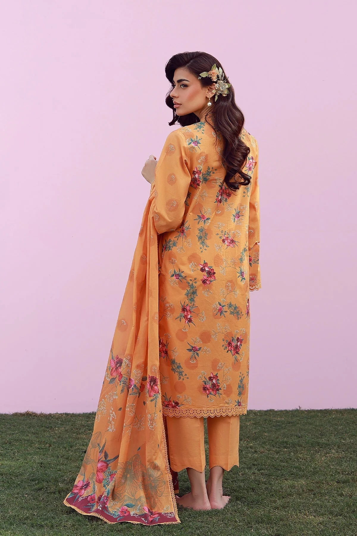 Fabric: Soft marigold hues adorned with dainty florals for a gentle, radiant look. The coordinated dupatta completes the story, paired with tonal pants. Warm, feminine, and timelessly appealing. 1-Digital Printed SHIRT (LAWN) -3M 2-Digital Printed DUPATTA (LAWN) -2.5M 3-DYED TROUSER (CAMBRIC) -2.5M |