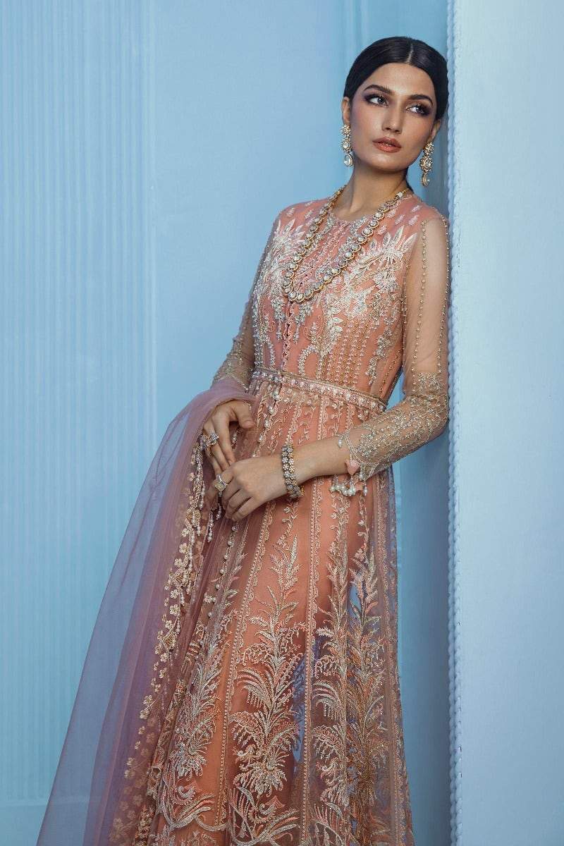 Fabric: Ravishing hues of pastels come to life in this ensemble. This dream worthy soft peach shirt is embroidered with gota, pearl and cut dana on peach net. This ensemble is showered with intricate embroidery on the back and gota and sequins on the sleeves and borders. Paired with a tea pink dupatta with tilla and sequins embroidery along with peach rawsilk trouser. A majestic and elegant ensemble