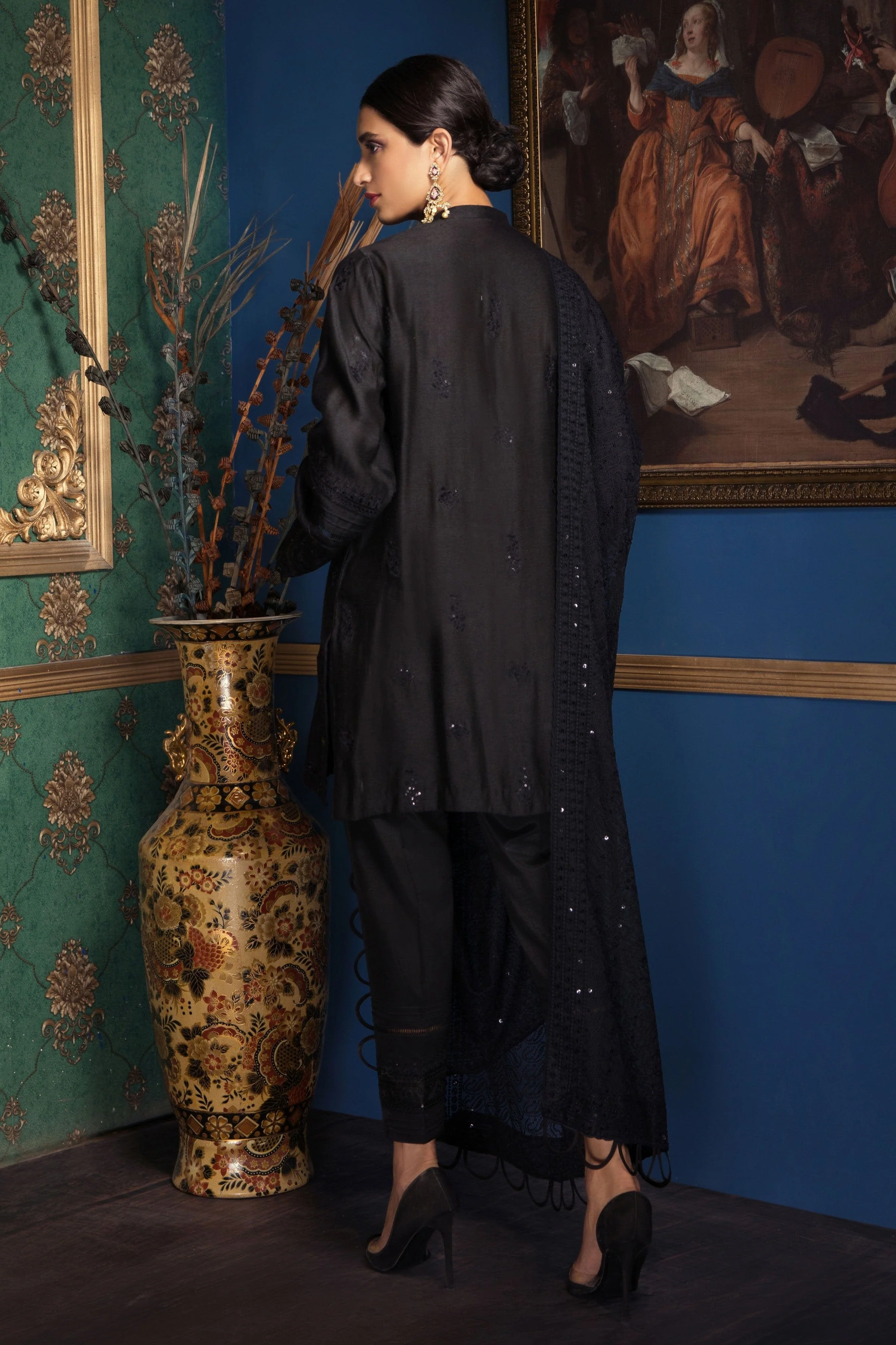 Fabric: An elegant black look worked in a fully monochrome vibe, this outfit features an embroidered silk cotton net shirt, blended chiffon dupatta, raw silk trouser and a matching slip. Unstitched 3-Piece Shirt Color: Black Trouser Color: Black Dupatta Color: Black Style Note |
