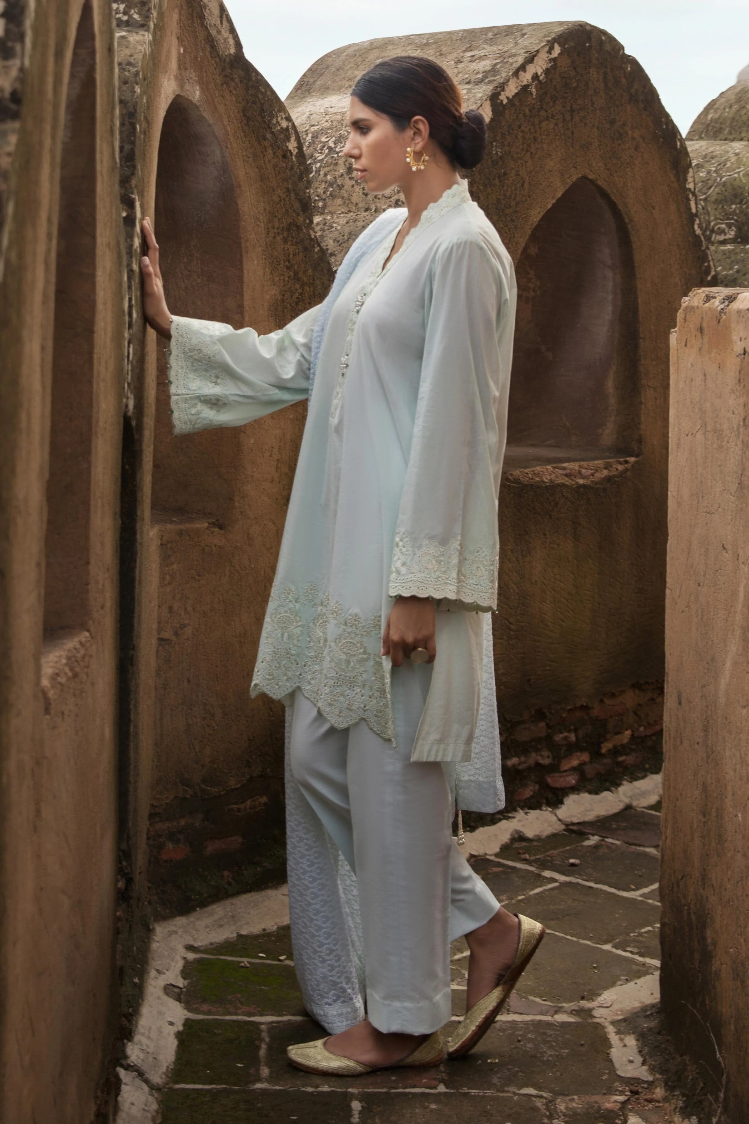 Fabric: This dreamy sage ensemble comprises of an embroidered cotton shirt and matching slub cambric trousers. Unstitched 2-Piece Shirt Color: Pale Aqua Trouser Color: Pale Aqua Style Note |