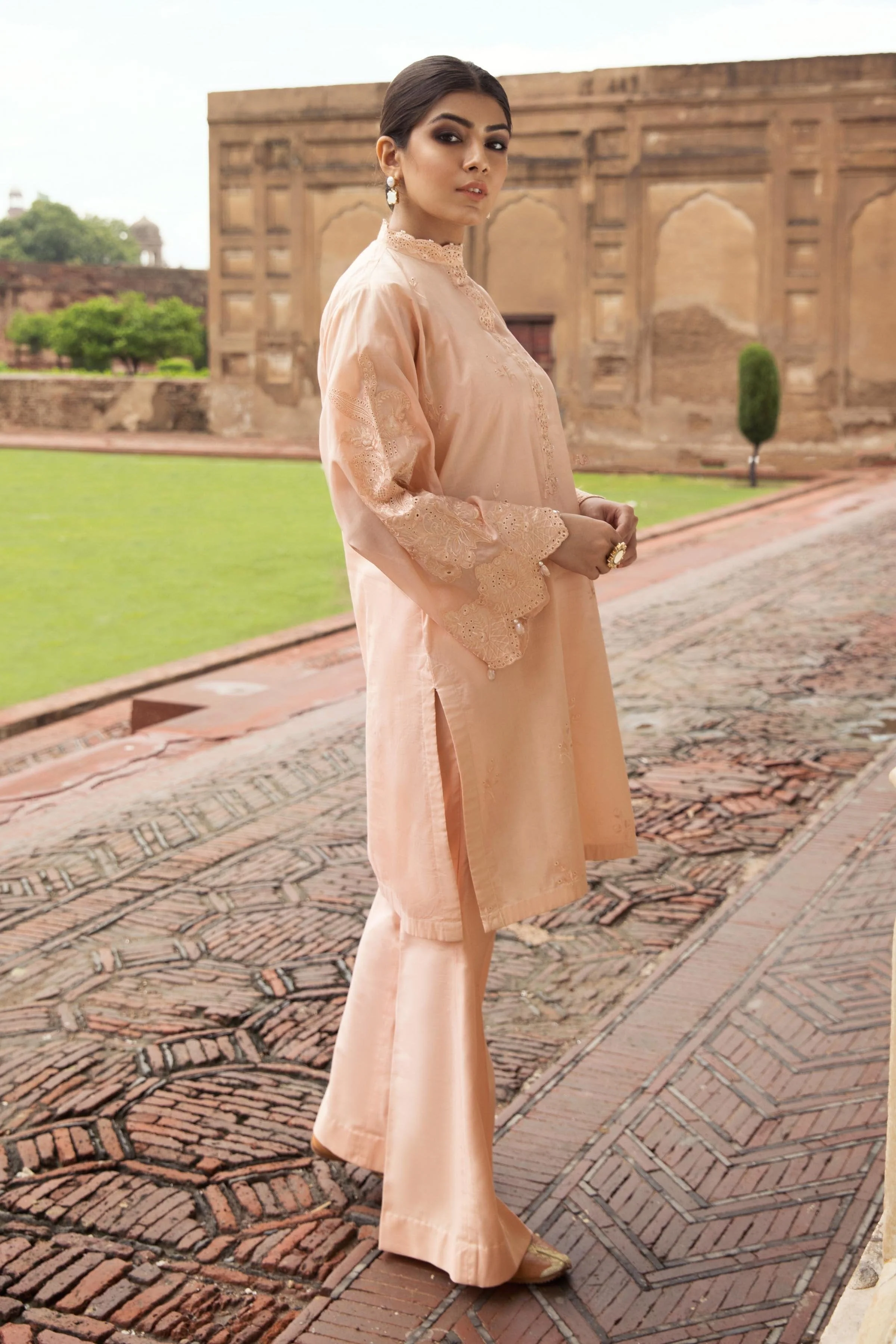 Fabric: This juicy peach summery ensemble comprises of an embroidered cotton shirt with organza accents and matching slub cambric trousers. Unstitched 2-Piece Shirt Color: Peach Trouser Dyed Slub Cambric Trouser 2.5m Color: Peach Style Note |
