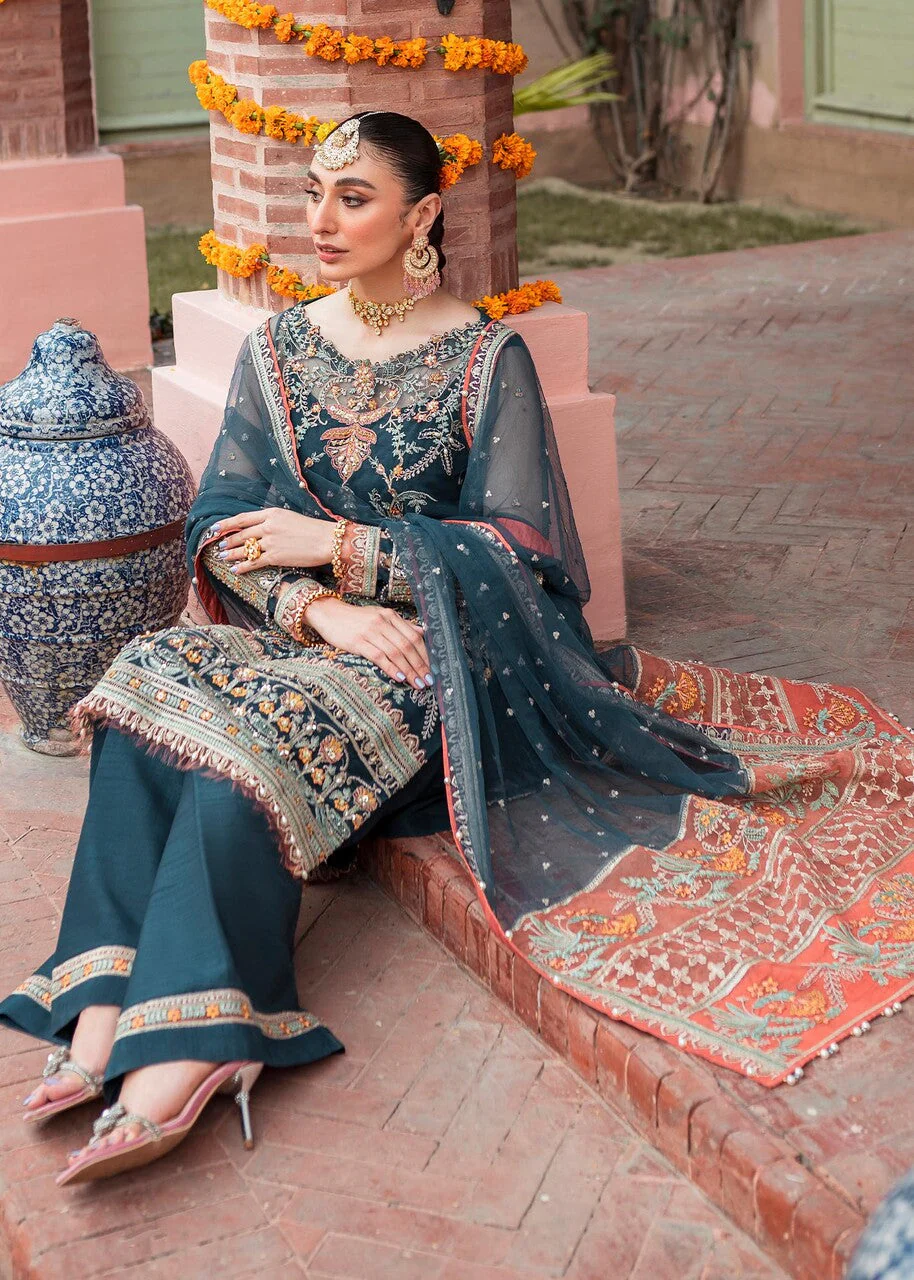 Kashaf is a regal teal ensemble set on soft bareeze net with an exquisite floral pattern brought to life with multicoloured resham and gold tilla embroideries. A fiery rust adds a sharp contrast to the teal with crystal and pearl beading layered over naqshi and sequin embellishments. The teal net fully embroidered dupatta has a four side floral pattern with beautiful floral pallu borders on deep rust.
