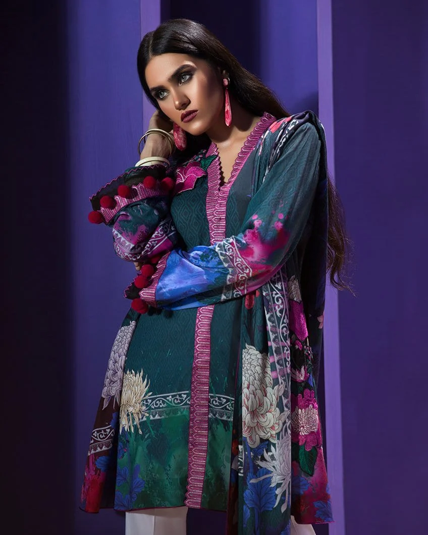 Fabric: Vivid floral prints and embroideries pop on the deep jewel tone of this design. Paired with a tastefully illustrated voile dupatta. - Digital printed dupatta (voile) 2.50 meters - Printed shirt front (lawn) 1.25 meters - Printed shirt back (lawn) 1.25 meters - Printed sleeves (lawn) 0.65 meters - Embroidered neck border (organza) 1.30 meters - Embroidered front patch (organza) 02 pieces |